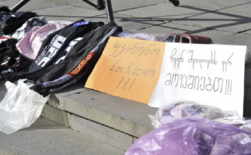 მთავრობის ადმინისტრაციისთან, კორონავირუსის პრევენციის მიზნით არსებული რეგულაციების მოხსნის მოთხოვნით აქცია იმართება