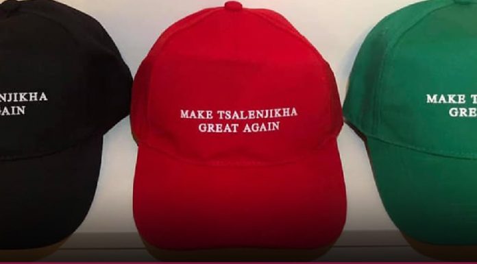 ფოტოზე სამი სხვადასხვა შეფერილობის ქუდზე ინგლისურად აწერია "დაე შევქმნათ დიდებული წალენჯიხა კიდევ ერთხელ".