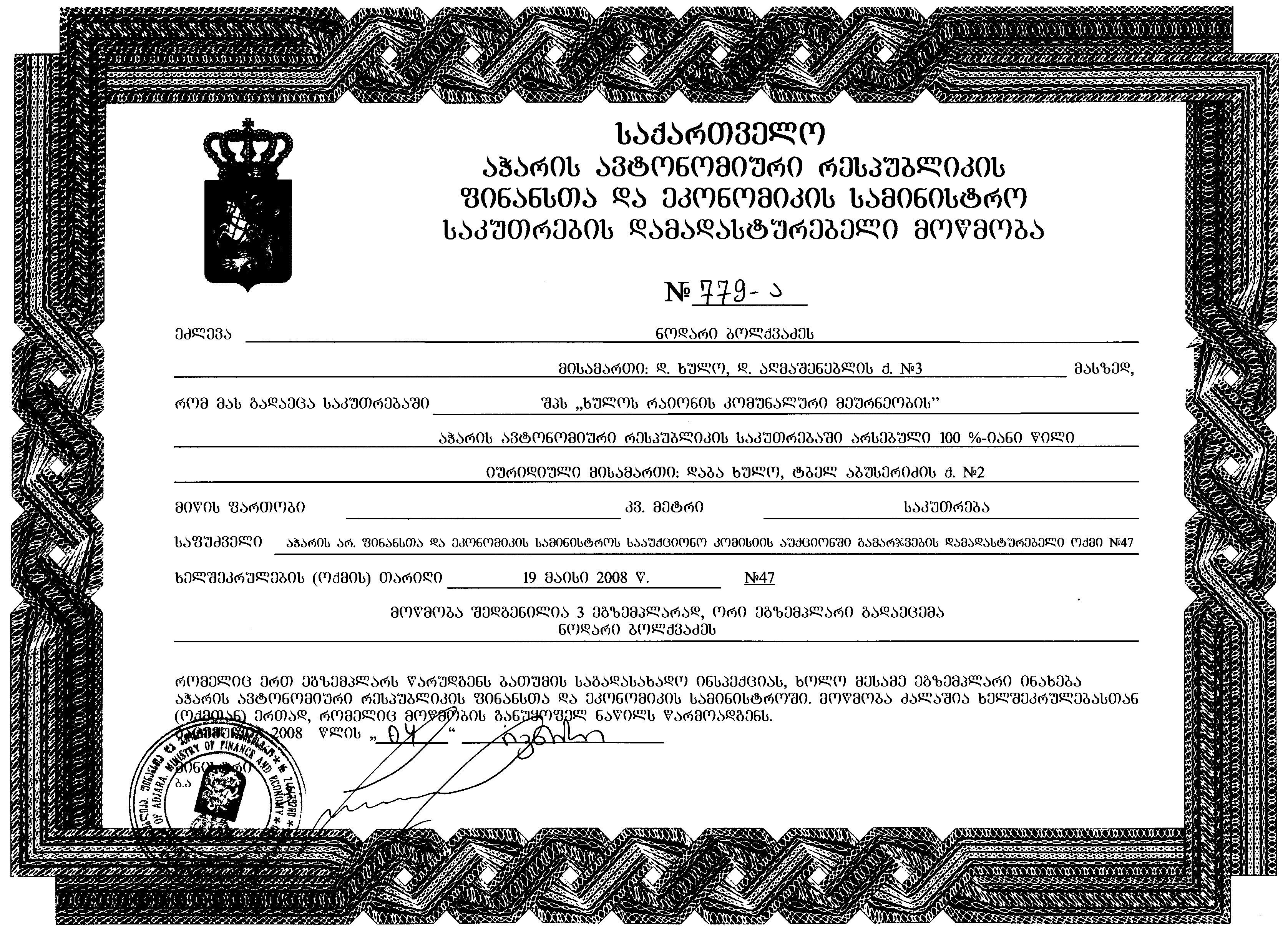 2018 წლის 2 ივლისს, რომან ბოლქვაძემ თავისი 50%-იანი წილი უსასყიდლოდ გადასცა გურანდა გობაძეს (ანზორ ბოლქვაძის რძალს), ხოლო კომპანიის ახალ იურიდიულ მისამართად ხულოს რაიონი, სოფელი ვაშლოვანი მიუთითა; გურანდა გობაძემ კი ეს წილი უსასყიდლოდ როინ აბულაძეს, მალევე, 2018 წლის ივლისში გადასცა.